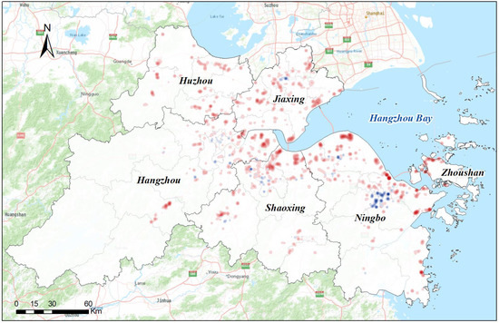 In using the kernel density estimator, we estimated the industrial land use intensity to understand the industrial clusters in the UAHB. As illustrated in Figure 11, the industrial intensity showed an increasing trend from the central urban area to rural areas, which indicated that the industrial size was increasing and the distribution was more centralized at the urban fringes. We found that scores of industrial clusters have formed that are mainly located in eastern Hangzhou, the Huzhou border region (along Tai Lake), northern Shaoxing, coastal Jiaxing, coastal Ningbo, and northern Zhoushan mainland. Moreover, the cluster areas (Figure 11b) that are located across Hangzhou Bay tended to increase sharply in quantity and in magnitude, which suggested that the integration and union of the coastal industrial zone through transportation networks such as cross-sea bridges will be important means for the regional government to strengthen industry development in the UAHB.