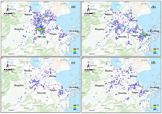 where is the density estimated at the location of observation , n is the total number of observations, K is the kernel function, h is the bandwidth parameter, and di is the distance from the observation to the ith observation. In this study, the kernel function K was defined as the area of each industrial land that was extracted via photointerpretation based on GE images. The selection of the bandwidth parameter h, which dictates the smoothness degree of an estimated density surface, is an essential task in practice. As the bandwidth h increases, the density surface will become smoother. If the bandwidth is too large, the key spatial fluctuations may be missed due to over-smoothing. If the bandwidth is too small, the surface will turn out to be highly fractured, thereby generating redundant wiggles [35]. Given all this, the bandwidth parameter h in this study was set to 2 km at the UAHB scale through tests.