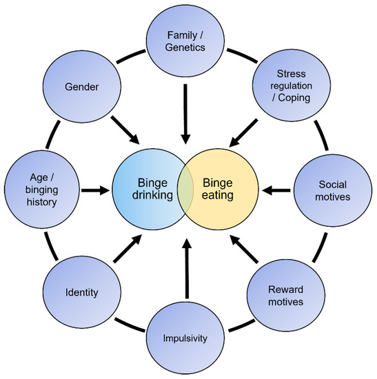 - Pompili, S.; Laghi, F. Binge eating and binge drinking among adolescents: The role of drinking and eating motives. J. Health Psychol. 2017, 24, 1505–1516. [Google Scholar] [CrossRef] [PubMed]