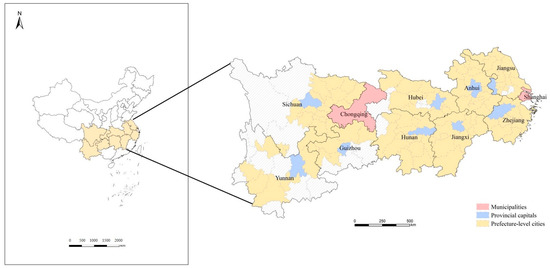 The YREB is an economic circle near the Yangtze River that includes two municipalities (Shanghai and Chongqing) and nine provinces (Jiangsu, Zhejiang, Anhui, Jiangxi, Hubei, Hunan, Sichuan, Yunnan, and Guizhou) (Figure 1). The YREB spans three regions in China, east and west, and has unique advantages and great development potential. The YREB accounts for 21.4% of China’s land area in terms of land resources and 42.9% of China’s population and contributed 46.5% of China’s GDP in 2020 (China Statistical Yearbook 2021). In recent years, the coercive effects of rapid urbanization on the YREB ecosystem have become increasingly prominent, seriously threatening the sustainable development process of the YREB. Therefore, scientific evaluation of RECC in each city of the YREB is important for formulation of sustainable development policies in the YREB in general and in specific cities in particular. In this paper, 110 cities in the YREB, including municipalities directly under the central government, provincial capitals, and prefecture-level cities, are studied.