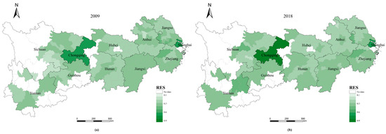 - Whether in 2009 (Figure 3a) or 2018 (Figure 3b), the two municipalities, Shanghai and Chongqing, have much higher RE indices than other cities and are the peak cities in the RES index in the eastern and western regions of the YREB, respectively. Furthermore, the RES index tends to decrease with the distance from these two cities to the periphery, while the provincial capitals generally have the next highest values of the RES index.
