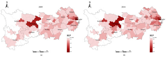 The spatial distribution of the REP index for cities in YREB in 2009 and 2018.