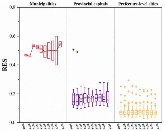 - Figure 5 shows that the RES index differs significantly between different cities within the same administrative level: the higher the administrative level of a city, the larger the RES index value usually is. Moreover, the higher the administrative level of a city is, the smaller the difference in the RES index between different cities within that administrative level. Compared to 2009, by 2018, the RES indices of both Shanghai and Chongqing municipalities had increased, but Chongqing’s RES index increased significantly faster than Shanghai’s; therefore, the gap in RES indices between the two increased significantly. The overall level of RES index for provincial capitals changed less, but the minimum, mean, and median increased and the extreme difference decreased, indicating that the gap in the RES index within provincial capitals is decreasing. Similar to the situation in provincial capitals, the minimum and extreme differences of the RES index for prefecture-level cities have also decreased, and the gap in the RES index between prefecture-level cities has decreased. As the RES index mainly reflects the city’s resource security capacity and environmental governance level, the higher the administrative level of a city is, the higher the resource security capacity and environmental governance level of the city. This may be related to the city’s higher level of economic and social development, so it has more sufficient financial resources to invest in related areas. On the other hand, the changes in the RES index for provincial capitals and prefecture-level cities suggest that some tail-end cities have made efforts to improve their resource security capacity and environmental governance levels and have achieved some desired results.