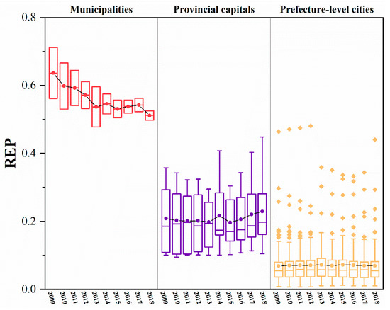 - Figure 6 shows that, similar to the case of the RES index, the higher the administrative level of a city is, the greater its REP index. In contrast to the change in the RES index, the difference in the REP index between the two municipalities decreased by 2018 compared to 2009. In contrast, the minimum, median, mean, and extreme differences of the REP index for provincial and prefecture-level cities all increased. As the REP index reflects mainly the level of economic development, social security capacity, and environmental pollution of cities, the levels of economic and social development and environmental pollution of provincial capitals and prefecture-level cities are all increasing. However, there is a large difference in the development rate between different cities at the same administrative level, with the head city within the level improving more significantly and the gap in development level between cities increasing further.