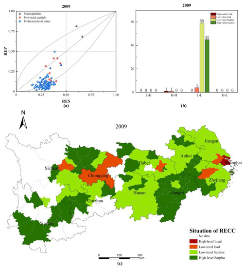 - Figure 7a–c shows that. in 2009, both municipalities directly under the central government were in RECC overload, with Shanghai in the high-level overload region and Chongqing in the low-level-overload region. Three provincial capital cities, Hangzhou, Wuhan, and Chengdu, had RECC in the low-level overload area. Among the prefecture-level cities, only Suzhou had RECC overload and was in the low-level overload area, while the RECC of other cities had not yet reached overload status, among which 59 cities are in the low-level surplus area and 45 cities are in the high-level surplus area. Meanwhile, all cities are L-L cities, except Shanghai and Chongqing, which are H-H cities.