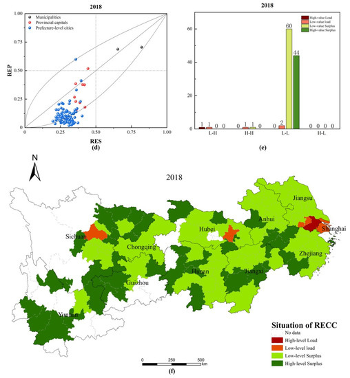 - Figure 7e,f shows that, by 2018, among the municipalities directly under the central government, Shanghai’s RECC was eased from a high-level overload area to a low-level overload area, with a further trend towards a low-level surplus area, while Chongqing’s RECC improved from a low-level overload area to a low-level surplus area. Among the provincial capitals, Wuhan and Chengdu’s RECCs were still in the low-level overload area, while Hangzhou’s RECC had improved from a low-level overload area to a low-level surplus area. Among the prefecture-level cities, the RECC of Wuxi also changed from a low-level surplus area to a low-level overload area, except for Suzhou, where the RECC deteriorated from a low-level overload area to a high-level overload area. The RECCs of the remaining cities had not yet reached overload status, with 60 cities in the low-level surplus area and 44 cities in the high-level surplus area. Shanghai and Chongqing were H-H cities, in addition to Chengdu and Suzhou, which had transformed from L-L to L-H cities, while the remaining cities were still L-L cities. This indicates that most of the YREB cities still had rich resource potential and environmental capacity and more room for future development.