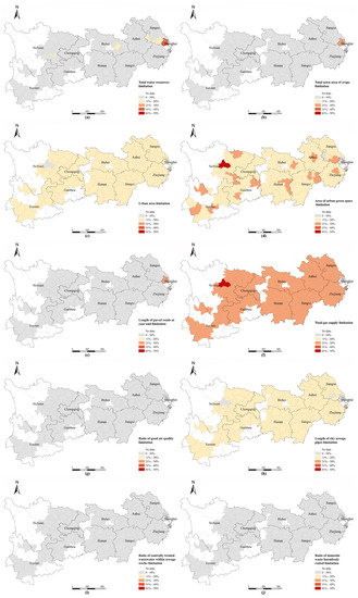 - Figure 8a shows that total water resources (S1) (Figure 8a) is the main obstacle to improving the supporting capacity of cities such as Shanghai, Suzhou, Wuxi, Nanjing, Wuhan, and Zigong. The main reason for this issue is that these cities have insufficient resource endowments of their own, and it is difficult to improve them effectively in the short term. They can alleviate water stress by strengthening water conservation facilities and improving water use efficiency. In addition, shows that grain sowing area (S2) (Figure 8b), built-up area (S3) (Figure 8c), and road mileage (S5) (Figure 8e) are also main barriers to improving support capacity in Shanghai. Shanghai differs significantly from the other YREB cities in that it has a smaller land area (85th) and an extremely high urbanization rate (over 90%), making it less well endowed in terms of natural resources and extremely rich in social resources. Furthermore, Shanghai does not have significant barriers to its environmental system due to its relatively good revenues, which enable it to invest heavily in environmental pollution control projects. These cities can be classified as ‘natural resource barrier’ cities. As natural resources are naturally endowed and cannot be enhanced in a short period of time, these barriers can be improved by increasing efficiency of resource use and enhancing rational distribution of regional resources.