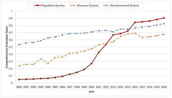 First, the overall evaluation scores of the population, resource, and environment systems in Jiangsu Province showed an upward trend. In 2000–2020, the resource and environment systems in Jiangsu Province increased from 0.24 and 0.53 to 0.67 and 0.82, respectively, and the core position of the population system gradually emerged, as its initial overall score was found to be much lower than those of the resource and environment systems.