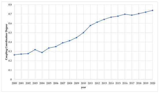 Based on the comprehensive evaluation scores of the population, resource, and environment systems in Jiangsu, the changes in the degree of coordinated development of the population, resources, and environment in Jiangsu were further investigated using Equations (9)–(11).