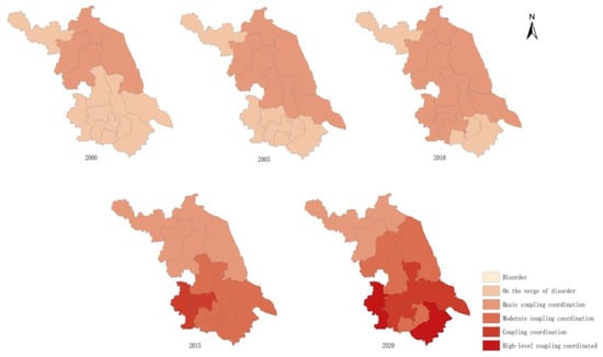Combining the stage characteristics of the rate of change in the coordination degree of the population, resources, and environment in Jiangsu and the results obtained from the GIS analysis software ArcGIS natural breakpoint method division, the coordination development degree was divided into six levels, as shown in Table 3.
