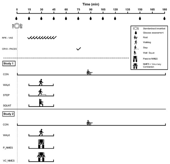 Schematic representation of the two studies. Participants consumed a meal consisting of 1 g of CHO per kg of body weight at the beginning of each visit in both studies. In Study 1, participants performed 30 min of walking (WALK), bench stepping (STEP) or isometric wall squat (SQUAT). In Study 2, participants performed 30 min of walking (WALK), passive neuromuscular electrical stimulation (P_NMES), or NMES superimposed on voluntary muscle contraction (VC_NMES). After the 30 min of exercise, participants remained seated for the remaining experimental period. The exercise sessions in both studies were compared to a control condition (CON), during which participants of each study remained seated for the whole experimental period. Every 3 min during the exercise sessions, the rate of perceived exertion (RPE) and the visual analogue scale (VAS) for discomfort were evaluated. At the end of the exercise, the Category Ratio 10 (CR10) and the Physical Activity Enjoyment Scale questionnaire (PACES) were also used to assess perceived exertion and enjoyment of the exercise session. Glucose was regularly measured throughout the experimental period.