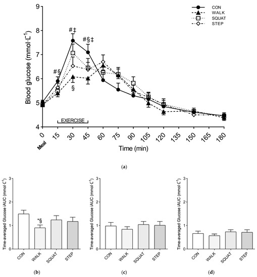 Glucose response over time (a) and time-averaged glucose iAUC at 0–60 h (b), 0–120 h (c), 0–180 h, and (d) after the meal, for Study 1. Symbols: *, p < 0.05 vs. CON; #, p < 0.05 vs. WALK; §, p < 0.05 vs. SQUAT; ‡, p < 0.05 vs. STEP. Values are reported as mean (± SEM).