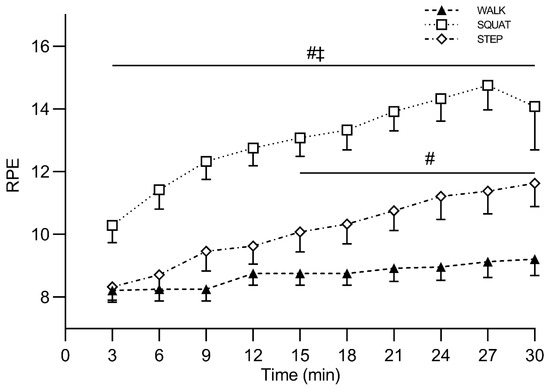 Rate of perceived exertion (6–20 RPE) during exercise, for Study 1. Symbols: #, p < 0.05 vs. WALK; ‡, p < 0.05 vs. STEP. Values are reported as mean (± SEM).