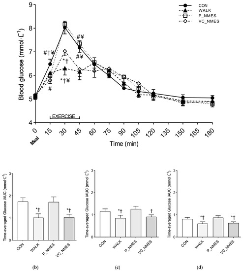 Glucose response over time (a) and time-averaged glucose iAUC at 0–60 h (b), 0–120 h (c), 0–180 h, and (d) after the meal for Study 2. Symbols: *, p < 0.05 vs. CON; #, p < 0.05 vs. WALK; †, p < 0.05 vs. P_NMES; ¥, p < 0.05 vs. VC_NMES. Values are reported as mean (± SEM).