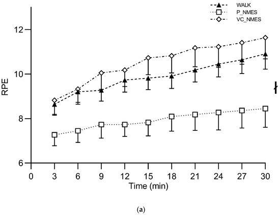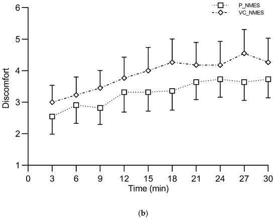 RPE did not show any significant main effect of time or interaction (condition × time), while a significant main effect of condition was found (p = 0.008, ηp2 = 0.386). Specifically, P_NMES showed significantly lower values compared with WALK (p = 0.029) and VC_NMES (p = 0.013). A significant main effect of time (p < 0.001, ηp2 = 0.413), but not of condition and interaction (condition × time), was found for the discomfort scale (Figure 5). The session rating of perceived exertion showed significantly higher scores for VC_NMES (3.45 ± 1.13) compared with WALK (2.45 ± 0.52) and P_NMES (1.77 ± 1.06) (p = 0.008 and p = 0.003, respectively). Conversely, no between-condition differences were observed for the PACES questionnaire total scores (WALK, 86.27 ± 23.72; P_NMES, 79.82 ± 18.35; VC_NMES, 79.45 ± 17.84).