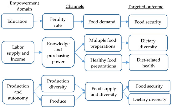 In food security, for instance, it has been reported that women’s empowerment in education reduces the fertility rate, in turn diminishing the overall food demand and easing regional food pressure [12,50]. Similarly, empowerment through inputs of production triggers yield abundance and a higher supply of foods that strengthen the status of food security [33].