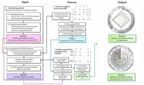 To fill all of the gaps, research was conducted to present dynamic assessments from four dimensions, health, economy, society and environment, for a city with reference to the MCDM Benchmarking Health Indicator Standard. Though the task to determine the positive ideal and negative ideal is challenging and time-consuming, as it requires the researchers to gather HIS values from reliable organizations for all 45 indicators, it has allowed the researchers to identify indicators that needed to be improved for the target city and had not been clearly shown in previous studies. Moreover, the model shown in this research is highly accurate without any overestimation and functional even in the case with one alternative while other research that uses other MDCMs, such as AHP-TOPSIS requires more than one alternative. In addition, while other research has not been able to identify whether each IDC meets the desired HIS value, this study proposes a city assessment model to identify the points that must be improved in dimensions, elements and IDCs to develop a city up to the preset standards. It also enables policymakers to understand problems from both an overall view and in detail, leading to effective policy formulation in city development. The paper aims to present dynamic evaluation model of health sustainability under MCDM with reference to health indicator standards to quantitatively assess sustainability from the health dimension together with the other three dimensions. The study consists of five sections. Section 1 introduces literature reviews. Section 2 elaborates on the methodologies of the study, starting from the selection of IDC, compilation of HIS and weight determination of each IDC and ending with the TOPSIS analysis. Then, Section 3 shows the results of the target city, Khon Kaen province in Thailand, and Section 4 and Section 5 conclude the study with a discussion of limitations for future research.