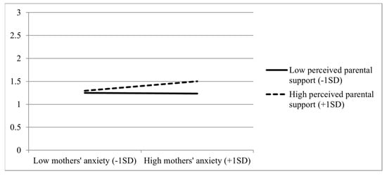 Children’s stress regressed on (centered) mothers’ state anxiety, (centered) perceived parental support, and their interaction (Table 2), with the aim of testing whether perceived parental support moderated the associations between mothers’ anxiety and children’s stress. As hypothesized, the effect of the interaction was significant. As shown in Figure 1, mothers’ anxiety was positively associated with children’s stress only when perceived parental support was high (+1 SD, b = 0.17, SE = 0.06, p = 0.005), but not when perceived parental support was low (−1 SD, b = −0.01, SE = 0.05, p = 0.816).
