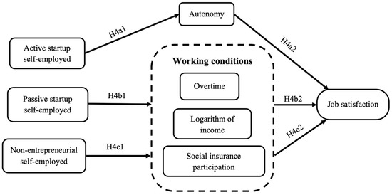 H4a2. Work autonomy is the influencing mechanism that improves their job satisfaction (see Figure 2). Passive start-up self-employed workers engage in self-employment activities because of a lack of good job offers. Compared with employed workers, their competitiveness and income level are low. Therefore, they have to work longer hours to balance the input and output and to further ensure that their income is sustainable and develops [