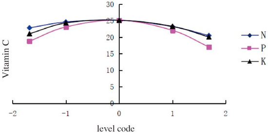 The Vc content in melon increased with the amount of chemical N fertilizer increasing from −1.682 to −0.2844 and reached a maximum when the N level was −0.2844. however, it decreased with the N level varying from −0.2844 to 1.682. The content of Vc was the highest when the levels of P and K fertilizers were −0.1015 and −0.5942, respectively. The curves indicated that the application of P fertilizer played the most important role in increasing Vc content in melon; K fertilizer came second; N fertilizer only ranked third. In the present study, the application of chemical N, P, and K fertilizers in a lower rate significantly increased the Vc content. After reaching the maximum level, the continuous application of K and P fertilizers would reduce the content of Vc in melon on the contrary.