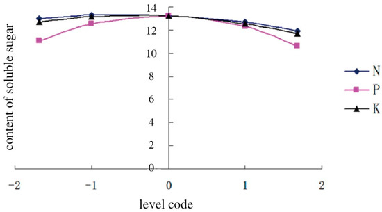 The three curves are shown in Figure 3 to depict the effects of changes in the amount of fertilizer application on soluble sugar content. The content of soluble sugars in melon increased firstly after declining with the chemical N fertilizer application (−1.682 to 1.682), and it reached the maximum level when the N level was −0.5866. When the levels of P and K fertilizers were, respectively, −0.0762 and −0.1574, the melon exhibited the highest content of soluble sugars. The curves indicated that the application of P, K, and N fertilizers, in order, played significant roles in raising the soluble sugar content in melon.