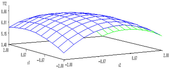 Y(1,2) = 13.2465 − 0.3197X1 − 0.1299X2 − 0.2725X12 + 0.1338X1X2 − 0.8522X22.