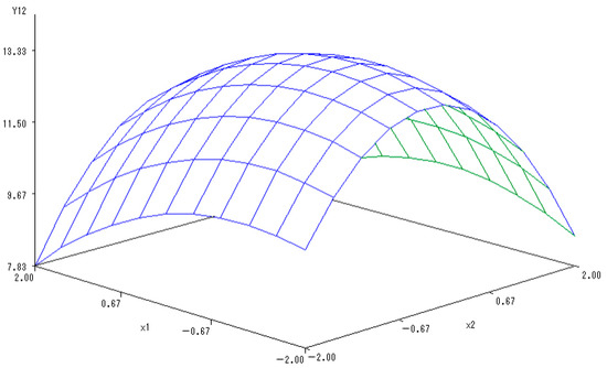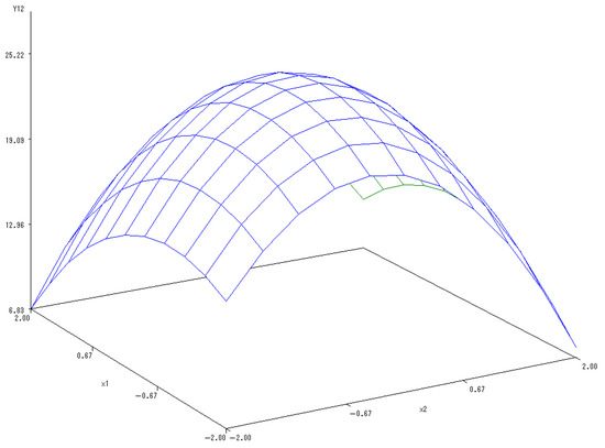Y(1,2) = 25.1389 − 0.697X1 − 0.5169X2 − 1.2254X12 + 0.715X1X2 − 2.5473X22.