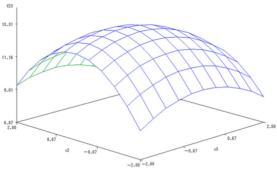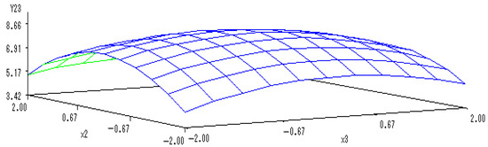 Y(2,3) = 13.2465 − 0.1299X2 − 0.3148X3 − 0.8522X22 − 0.1438X2X3 − 0.3768X32.