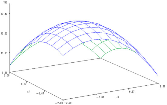 Y(1,3) = 8.6634 − 0.0797X1 − 0.1013X3 − 0.2601X12 − 0.0950X1X3 − 0.3573X32.