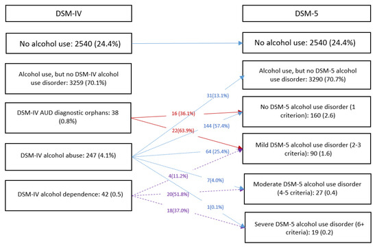 - Ghandour, L.A.; Anouti, S.; Afifi, R.A. The impact of DSM classification changes on the prevalence of alcohol use disorder and ‘diagnostic orphans’ in Lebanese college youth: Implications for epidemiological research, health practice, and policy. PLoS ONE 2020, 15, e0233657. [Google Scholar] [CrossRef]