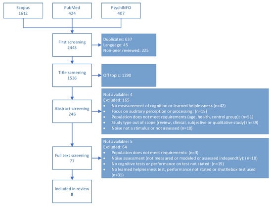 The papers had to be related to the sound environment and/or noise exposure and perform both cognitive and helplessness (motivational) tests. The research terms “cognition” and “helplessness” were separated by “OR” because the results may have been published separately or because a cognitive or helplessness test may have been performed and not mentioned in the title or abstract.