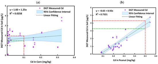The safety thresholds for Cd in the rice/sweet potato and peanut are 0.1 mg/kg and 0.5 mg/kg, respectively, according to the National Food Safety Standard Limits of Contaminants in Foods (GB2762-2017) in China. Upon the results from Figure 3, we can assess the safety of agricultural soils according to the DGT measured Cd concentrations in soils based on the safety thresholds for the peanut, rice, and sweet potato (the red dashed vertical line in Figure 3). Using the 95% confidence interval (Figure 3), we can believe that, when the DGT measured Cd concentrations in soils are lower than the lower confidence limits (green dashed horizontal line in Figure 3), the soils are safe for the specific crop planting; when the DGT measured Cd concentrations in soils were higher than the upper confidence limits (red dashed horizontal line in Figure 3), the soil would be unsafe for the specific crop planting. The estimated safe and unsafe concentrations by the DGT measurements (Table 3) in soils can be applied to predict the safety of the agricultural soils for specific crop planting on the East edge of the Dongting Lake.