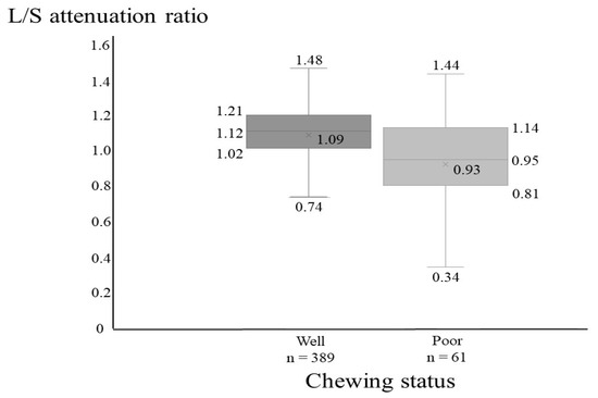 Figure 1 shows the L/S attenuation ratio values for good and poor chewing status. Compared with participants with good chewing status, those with poor chewing status (n = 61, 14%) were more likely to have a low L/S attenuation ratio (p < 0.001).