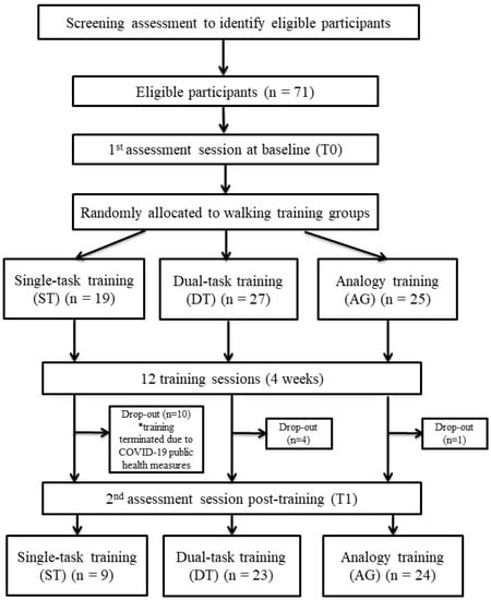 This study consists of a three-arm, parallel group, randomized controlled trial (RCT). Participants were randomly allocated into a single-task (ST) (active control), a dual-task (DT), or an analogy (AG) walking training group. The study protocol was published [23] and preregistered at ClinicalTrials.gov (NCT03811782).