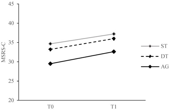 Comparison of movement-specific reinvestment propensity (primary outcome) from T0 to T1 for all training groups. MSRS-C, Chinese version of the Movement Specific Reinvestment Scale; ST, single-task training group; DT, dual-task training group; AG, analogy training group.