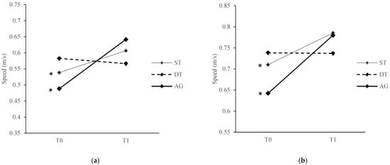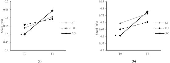 Comparison of single-task walking abilities at (a) comfortable speed and (b) fast speed from T0 to T1 for all training groups. * denotes p value < 0.05 for the difference between T0 and T1. ST, single-task training group; DT, dual-task training group; AG, analogy training group.