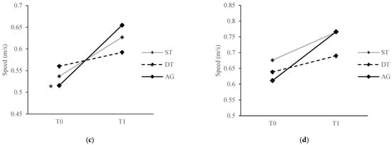 Comparison of dual-task walking abilities at (a) a verbal task at a comfortable speed; (b) a verbal task at a fast speed; (c) a visual-spatial task at a comfortable speed; and (d) a visual-spatial task at a fast speed from T0 to T1 for all training groups. * denotes p value < 0.05 for the difference between T0 and T1. ST, single-task training group; DT, dual-task training group; AG, analogy training group.