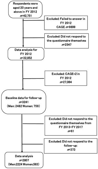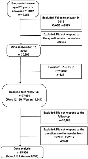 Figure 1 presents the participant flow chart. The target population comprised 43,990 adults, aged 20 years and above, who responded to the FY 2012 survey (response rate 19.9%, n = 184,507). The sample population excluded those who did not answer the CAGE questionnaire in FY 2012 (n = 9899) and who did not respond to the questionnaire independently (n = 2547), because CAGE can only be assessed through self-response. Furthermore, respondents with a CAGE score of ≥2 (n = 3241) in FY 2012 were excluded. The remaining 27,064 respondents (men: 12,120; women: 14,944) formed the baseline sample for follow-up. Likewise, those individuals who did not respond on their own to the assessment from FY 2013 to FY 2017 (n = 620), and did not respond to the follow-up (n = 10,468), were excluded. Thereafter, the longitudinal data were obtained for 15,976 participants (men: 9117; women: 6859).
