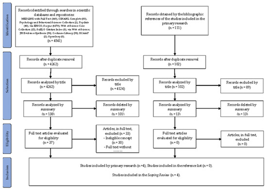 This section organizes and summarizes the results obtained in the development of the ScR, presented in a visual representation. The search identified 4541 potentially relevant articles, of which 279 were removed for being duplicates; of the remaining 4262 articles, 4124 were excluded by title analysis; of the remaining 138 articles, 101 were excluded after analysis of the abstract; of the remaining 37 articles, 33 were excluded after reading the full text, with 30 articles presenting ineligible population, concept and context and three articles without access to the full text. We finally included four articles in the scope review. In the secondary search of the bibliographic references of the studies included in the primary search, 111 potentially relevant articles were obtained. Nine were eliminated because they were duplicated. Of the remaining 102 articles, 89 were excluded after title analysis; of the remaining 13 articles, all were excluded after analysis by abstract. Zero articles were included in the ScR (Figure 1).