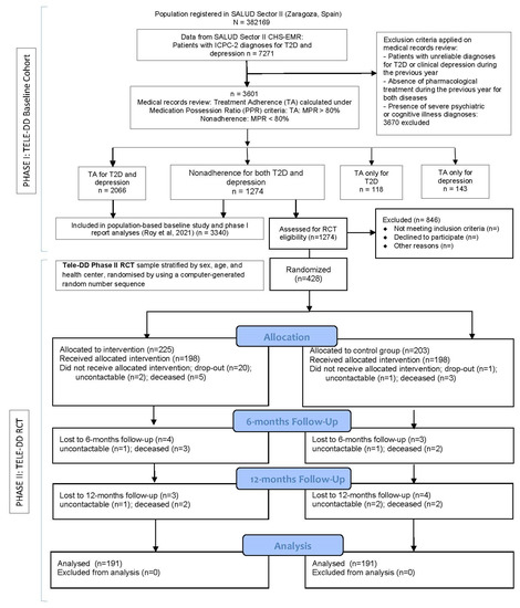 - Roy, J.F.; del Hoyo, M.L.L.; Urcola-Pardo, F.; Monreal-Bartolomé, A.; Ruiz, D.C.G.; Borao, M.M.G.; Alcázar, A.B.A.; Casbas, J.P.M.; Casas, A.A.; Funcia, M.T.A.; et al. The TELE-DD Project on Treatment Nonadherence in the Population with Type 2 Diabetes and Comorbid Depression. Sci. Rep. 2021, 11, 8889. [Google Scholar] [CrossRef]