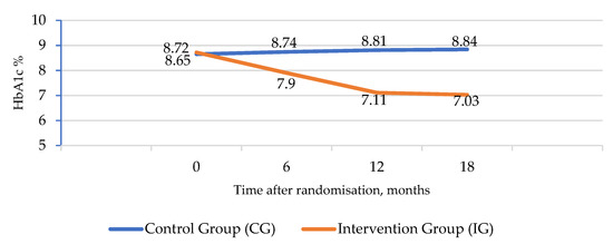 The trial primary outcome was glycated haemoglobin (HbA1c) due to its proven causality on T2D complications. Comparing the values at month 0 and month 18, the mean HbA1c value in the CG increased slightly (8.65 at month 0 to 8.84 at month 18), and in the IG, it was clearly decreased (8.72 at month 0 to 7.03 at month 18) in all three cases; p < 0.01, including the interaction of both factors (Table 2) (Figure 2).