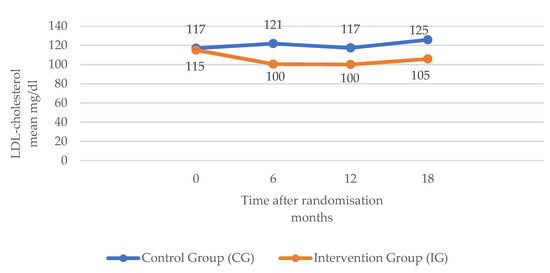 Secondary outcomes: included LDL-C and BMI. LDL-cholesterol: Mean values increased slightly over the trial 18-months follow-up in the CG (117.07 mg/dL month 0; 125.87 mg/dL month 18); the IG values decreased at the end of the trial but slightly increased between months 12 and 18. Test values were significant (p < 0.001) in the three cases, both in the comparison by time and between groups as well as in the interaction of both factors (Table 2). Mean BMI values of both CG and IG groups at month zero were similar (around 30), while in the CG, there was a slight increase (30.49 at month 0; 30.78 at month 18; difference: plus 0.29), the mean BMI in the IG decreased slightly and progressively during follow-up (30.42 at month 0; 30.05 at month 18; difference: minus 0.37). BMI was the variable that was proven to remain the most constant over time in the IG. Mean systolic blood pressure in the CG increased by almost thirteen points (134.41 mmHg month 0; 147.29 mmHg month 18), but only slightly in the IG (difference: 0.31 points). The evolution of the mean diastolic blood pressure values of both groups at different times had similar behaviour, decreasing slightly, although more so in the IG. In the CG, the total difference between the initial and final time was 2.61 points, while in the IG, it was 5.24 points. In the respective statistical tests, significant differences were obtained in both the comparison by time and by group as well as in the interaction p < 0.001 (in the latter, the significant differences occurred between the groups from month 12 onward) (Table 2) (Figure 3 and Figure 4).