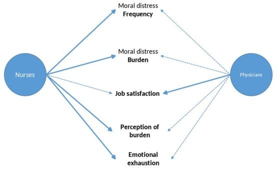 As nurses and physicians have different roles, it is of high relevance to assess these two groups differentially. Our results confirmed previous studies maintaining that nurses were more susceptible to MD than physicians [,,,]. This could be due to their significantly closer work with the patient and the closer exchange with relatives. Nurses often see themselves as advocates for the patient in interprofessional work on the ward. These relational challenges may worsen nurses’ MD. Moreover, in the end, the physician bears the responsibility for a patient’s treatment, which might constitute a different kind of burden and stress. With different hierarchical positions and experiences of the respective professions, the impact of external and internal stressors can also vary, as well as their coping strategies [].