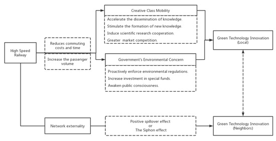 As a fast and environmentally friendly means of transportation, HSRs are not only convenient for people to travel but also significantly affect economic development and the natural environment [42,53]. Coupled with the investigation of the existing literature, this paper believes that HSRs exert an impact on green technology innovation mainly through two important mechanisms: creative class mobility and the government’s environmental concern. The conceptual diagram of this article is displayed in Figure 1.