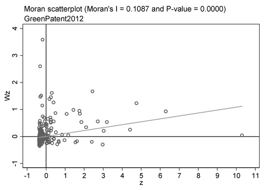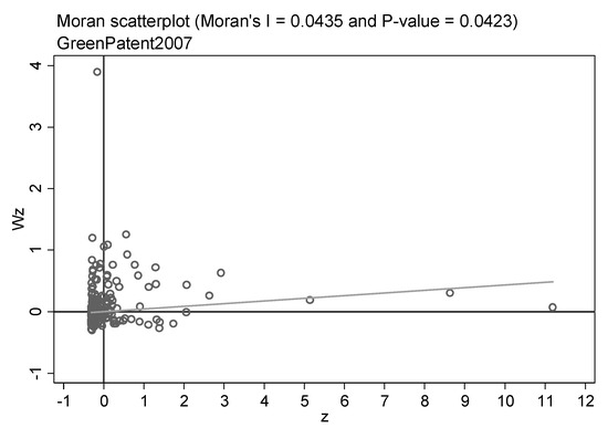 Before utilizing the spatial econometric model to assess the spillover influence, it is essential to examine the spatial correlation of the samples. Therefore, the global and local Moran indices of the green patent are calculated. Table 6 displays the outcomes of the global Moran index for all years of green patents. The global Moreland index was positive at the 1% confidence level for almost all years, and the value increased with the year. It means that green technology innovation has a positive spatial correlation, and the correlation is becoming more and more obvious. In addition, the local Moreland index scatter plots can reflect the spatial agglomeration features of green innovation. Due to the word limit, we only highlight the scatter plots for three years. Figure 2, Figure 3 and Figure 4 show the local Moreland index scatter plots of green patents in 2007, 2012, and 2018, respectively, reflecting the dynamic revolution of spatial agglomeration characteristics during the study period. The horizontal axis denotes the number of standardized green patent applications, and the vertical axis signifies the spatial lag value. it has been observed that a large number of cities are located in the first and third quadrants, revealing the agglomeration of similar values. It proves that green technology innovations are positively spatially correlated. Peng et al. [108] and Zhou et al. [109] hold similar views.