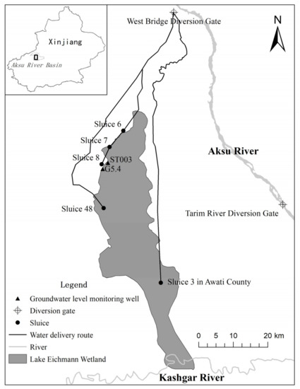 - Zhao, X.F.; Xu, H.L.; Zhang, P. Changes of Lake Area, Groundwater Level and Vegetation under the Influence of Ecological Water Conveyance—A Case Study of the Tail Lake of Tarim River in China. Water 2022, 14, 1026. [Google Scholar] [CrossRef]