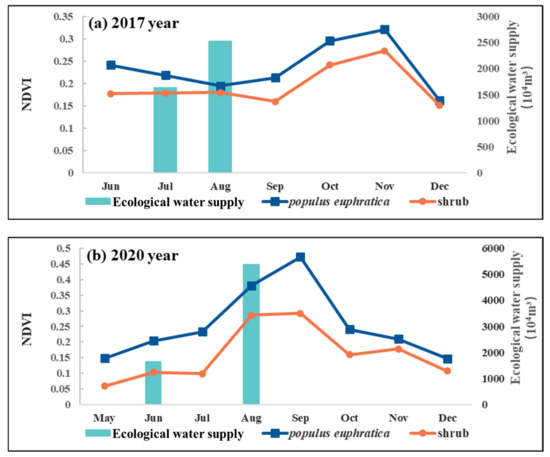 - Zhang, S.H.; Ye, Z.X.; Chen, Y.N.; Xu, Y.F. Vegetation responses to an ecological water conveyance project in the lower reaches of the Heihe River basin. Ecohydrology 2017, 10, e1866. [Google Scholar] [CrossRef]