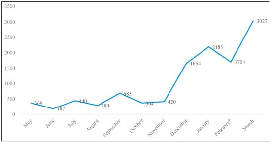 Number of tweets regarding the vaccine keyword over time. * Note: February data collection only includes data from 1–19 February.