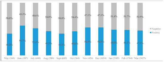 To answer the second research question, sentiment analyses were conducted by month to determine frequency (RQ2a) and polarity (expressed as overall positivity) across the timeframe (RQ2b). Results of this analysis are presented in Figure 2. Regarding positivity of tweets, the months with the highest amount of positive sentiment were June (56.7%), November and December 2020 (52.9% positive), and July 2020 (51.4% positive).