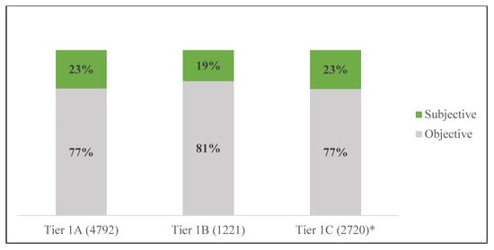 We repeated this same procedure to examine if subjectivity varied across vaccination tiers. All three tiers displayed higher amounts of objective tweets than subjective. According to Figure 5, Tiers 1A and 1C contained the highest amounts of subjective tweets (23% subjective and 77% objective). The lowest amount of subjective tweets was observed during the deployment of vaccines in Tier 1B (19% subjective and 81% objective).
